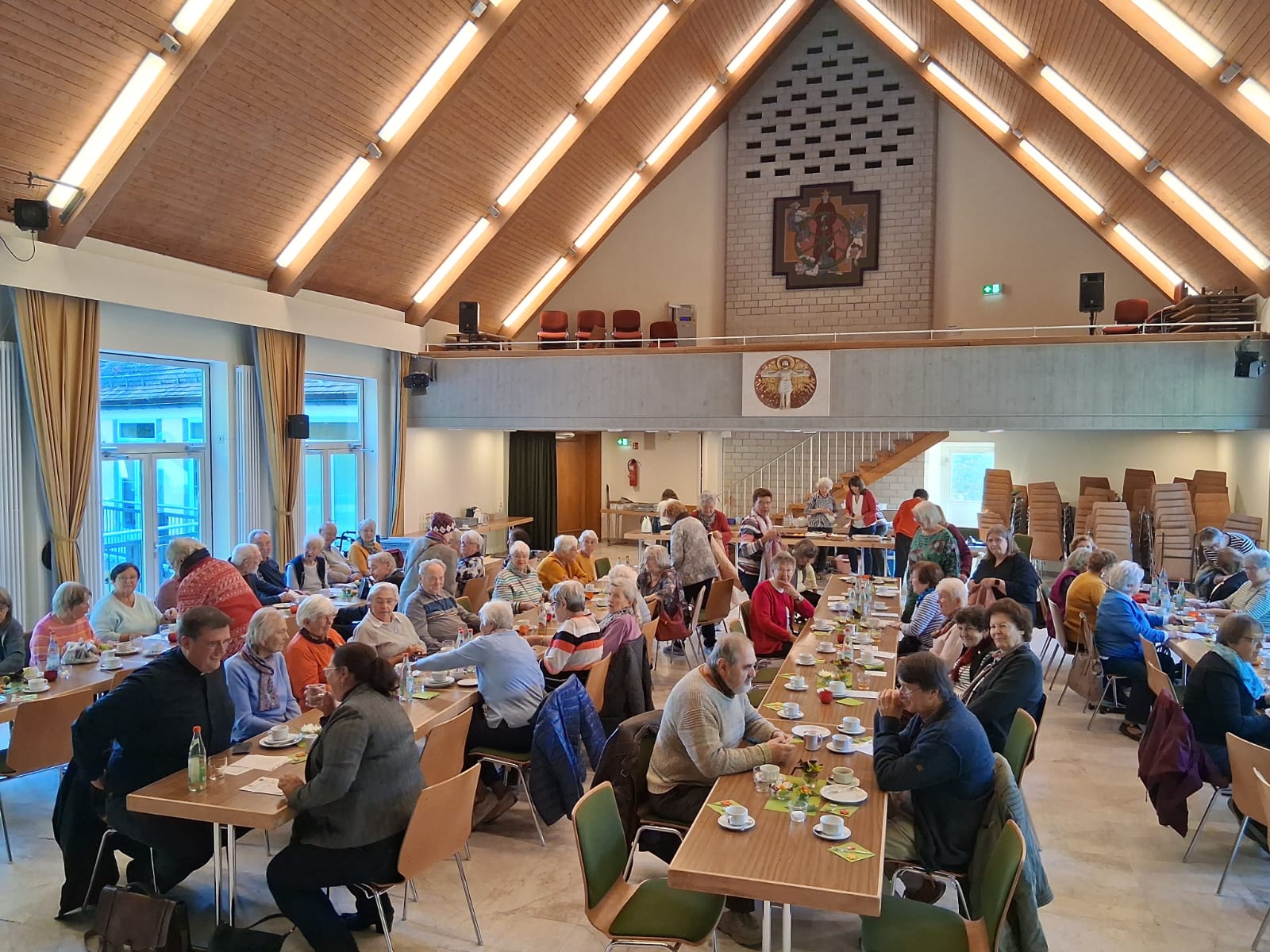 Mit großer Freude konnten wir wieder viele Gäste zu unserem 12. ökumenischen Senioren-Nachmittag im Pfarrsaal begrüßen. Innerhalb kurzer Zeit füllte sich der Saal. An der liebevoll gestalteten Tischdeko konnte man sehen, dass der Herbst immer noch wunderschöne Blüten für uns bereithält. Im ganzen Saal lag Kaffeeduft in der Luft und am reich gedeckten Kuchenbuffet mussten die auf Grund der großen Auswahl manchmal schwierigen Entscheidungen zur Kuchenauswahl getroffen.