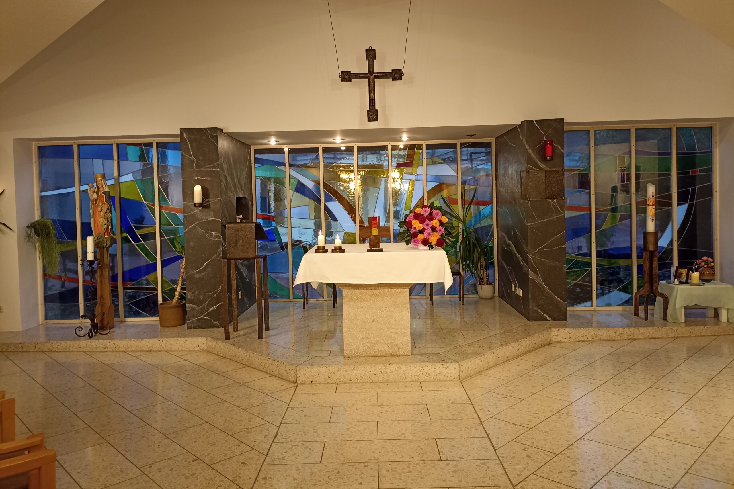 Die Rückwand des Sakralraumes bildet eine große, mit leuchtenden Buntgläsern abstrakt gestaltete Glasfensterfront, die von Günter Bauer entworfen und von Josef Olbrecht umgesetzt wurde und dem Raum einen freundlichen und lichtdurchfluteten Eindruck verleiht.
