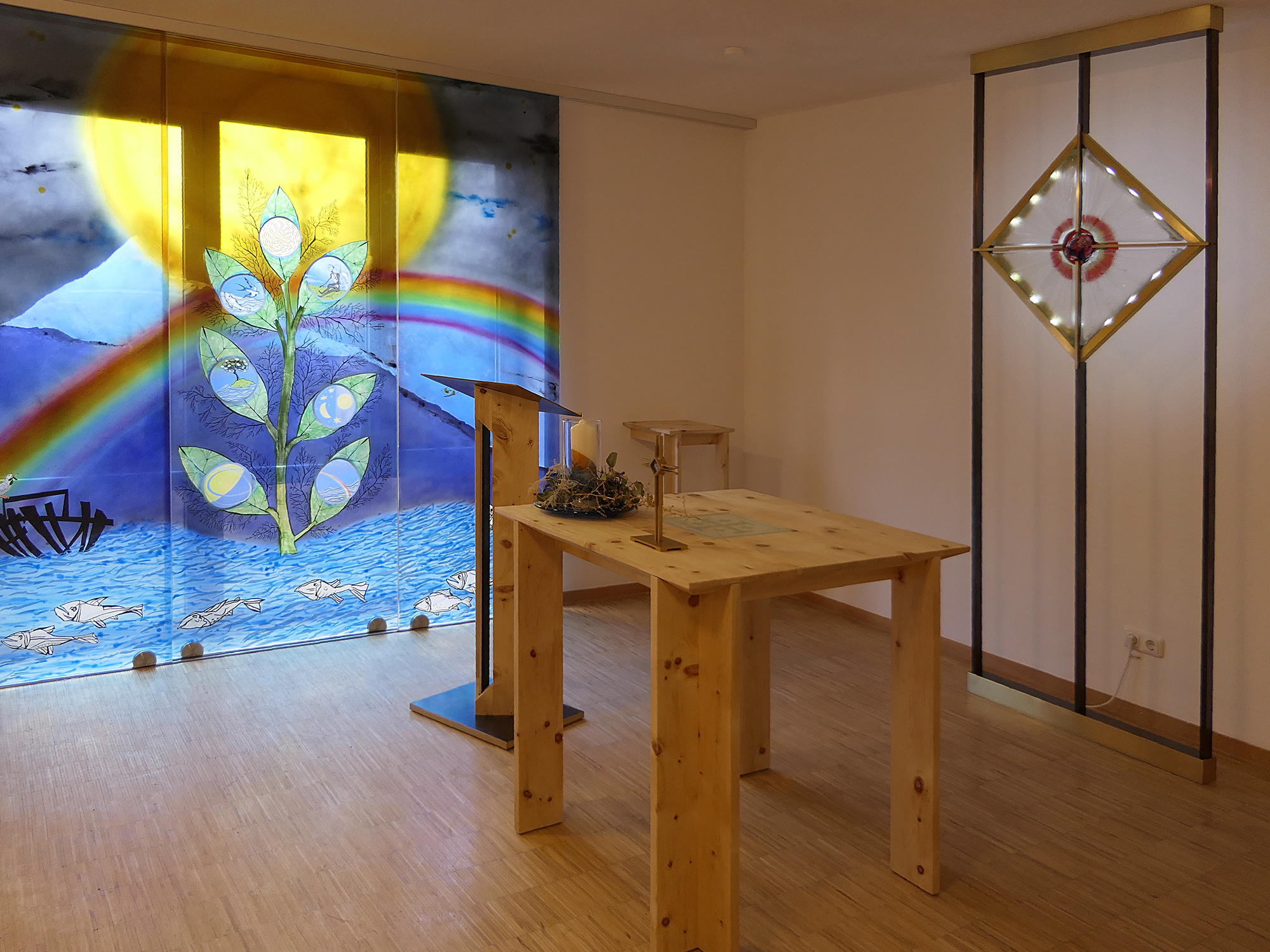 Betritt man die Kapelle, so wird der Blick auf ein in farbenfroher Glasmalerei gestaltetes Triptychon gelenkt, gestaltet von der Glaskünstlerin Frau Brigitte Schuster aus Schrobenhausen. Dieses beeindruckende dreiteilige Glasfenster zeigt in dichter Darstellung die Schöpfungserzählung nach der Bibel. Aus dem Wasser wächst der Baum, auf dessen Blättern die Stationen der Tage der Schöpfung sich entfalten, bis hin zum Licht am Ende des Lebens, aber auch Stationen der Angst und des Scheiterns am Beispiel des Flüchtlingsbootes. Dann noch das Symbol der Friedenstaube über der Urflut des Chaos am Schöpfungsbeginn – ein tröstendes Hoffnungszeichen. Um den Altar in der Mitte des Raumes – gestaltet von der Schreinerei Mahl aus Strobenried – stehen 12 Stühle in Erinnerung an das Abendmahl. An der Stirnseite findet sich ein großes Kreuzsymbol, in der Mitte ein rot leuchtendes Glaselement. Es steht für das hingegebene, verwundete Herz Jesu, auch für das leuchtende Licht am Ostermorgen.
