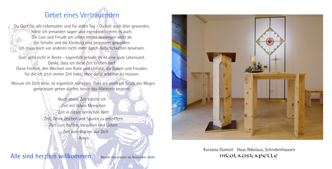 Ein Haus am Rande der Stadt Schrobenhausen, für manche unbekannt, vielleicht auch übersehen, aber ein Zuhause, auch oft zur Heimat geworden für 120 Menschen. Mit Betreuung und sehr persönlicher und zugewandter Fürsorge entstand in 14 Monaten eine neu gestaltete Kapelle, gewidmet und geweiht dem Hl. Nikolaus, dem Namensgeber des Hauses. Der Raum will den Menschen hier Platz geben für Körper und Geist, Herz und Seele im Alltag und in den besonderen Lebenssituationen, ob in Freude oder Schmerz.